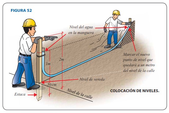 Con una de las estacas ubicadas al frente del terreno, se mide 1 m desde el nivel de la vereda y se marca. Luego, estiramos la manguera hasta alcanzar la segunda estaca, y valiéndonos del nivel de agua dentro de la manguera, trasladamos dicho nivel a esta segunda estaca. Para ello es importante esperar a que el nivel de agua se haya estabilizado (ver figura 52).