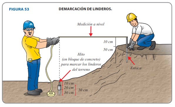 Utilizando las marcas en las estacas, ya podemos medir en forma horizontal y proceder a demarcar los linderos (ver figura 53). Si medimos en forma inclinada, siguiendo la pendiente, obtendremos medidas incorrectas.