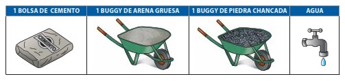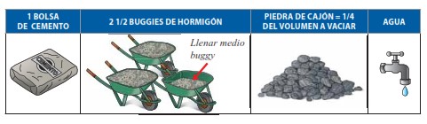 La cantidad de materiales debe guardar una proporción que por lo general es de una bolsa de cemento por 2 1/2 buggies de hormigón, con la cantidad de agua necesaria para obtener una mezcla pastosa y trabajable. Adicionalmente, se debe incorporar piedra de cajón en una proporción equivalente a una cuarta parte del volumen a vaciar, tal como se ve en la sección 1.12 de este manual.