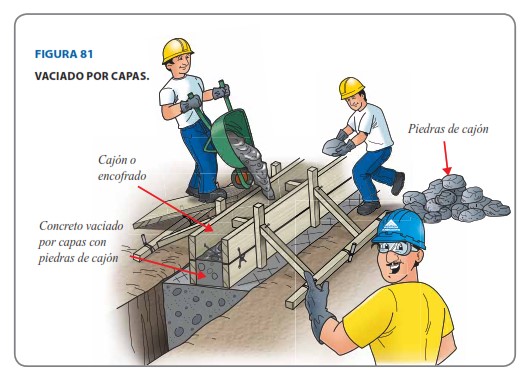 El vaciado de la mezcla se realizará por capas, es decir, se vaciará una capa de concreto, y luego, sobre ésta se colocarán las piedras y así sucesivamente hasta llegar a la altura que indica el plano (ver figura 81).
